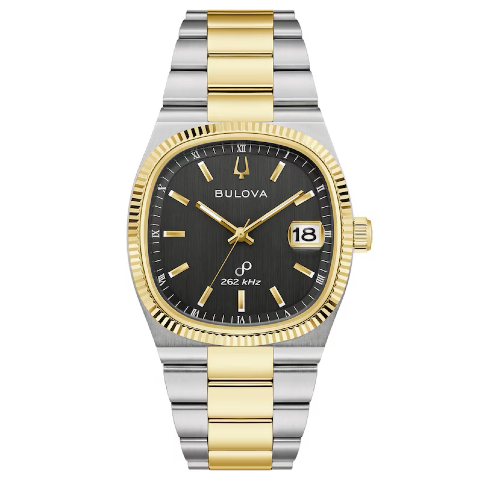 The Bulova Super Seville Men's Watch 98B458 combines a 38mm retro TV-shaped case with a grooved coin-edged bezel in gold-tone and silver-tone stainless steel, paired with a rich black dial featuring gold-tone hands and indexes. Powered by Bulova's Precisionist movement with an eight-jewel quartz mechanism, this timepiece is completed with a flat sapphire crystal, date magnifier, and a three-link two-tone bracelet with a push-button deployment clasp.