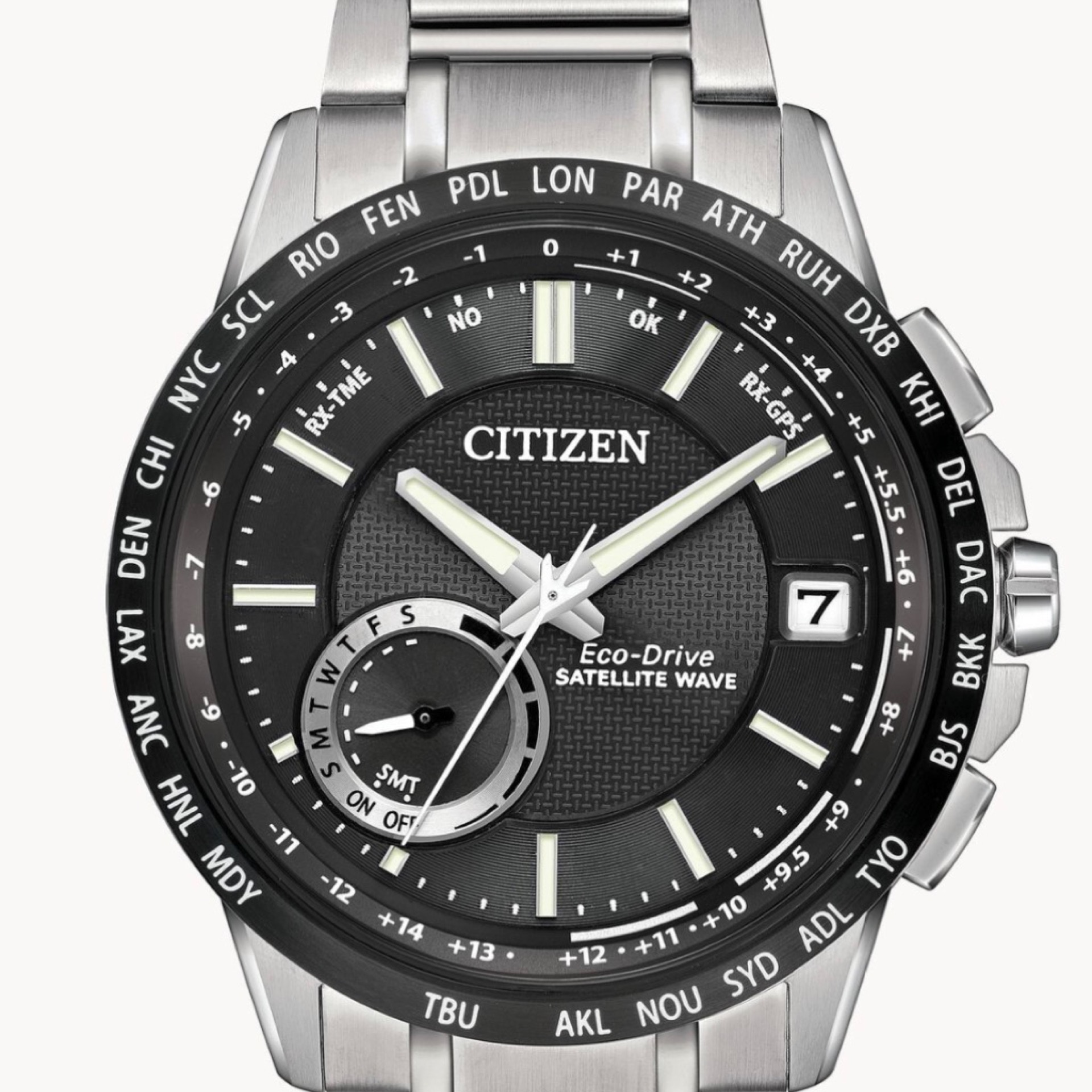 The Citizen Eco-Drive Satellite Wave GPS Men's Watch (Model: CC3005-85E) combines cutting-edge technology with a modern design. Powered by Eco-Drive technology, it operates using any light source, eliminating the need for battery replacements. The GPS timekeeping system ensures accurate time synchronization anywhere in the world. Featuring a sleek stainless steel case and black dial, this watch is both functional and stylish, suitable for daily wear or travel.