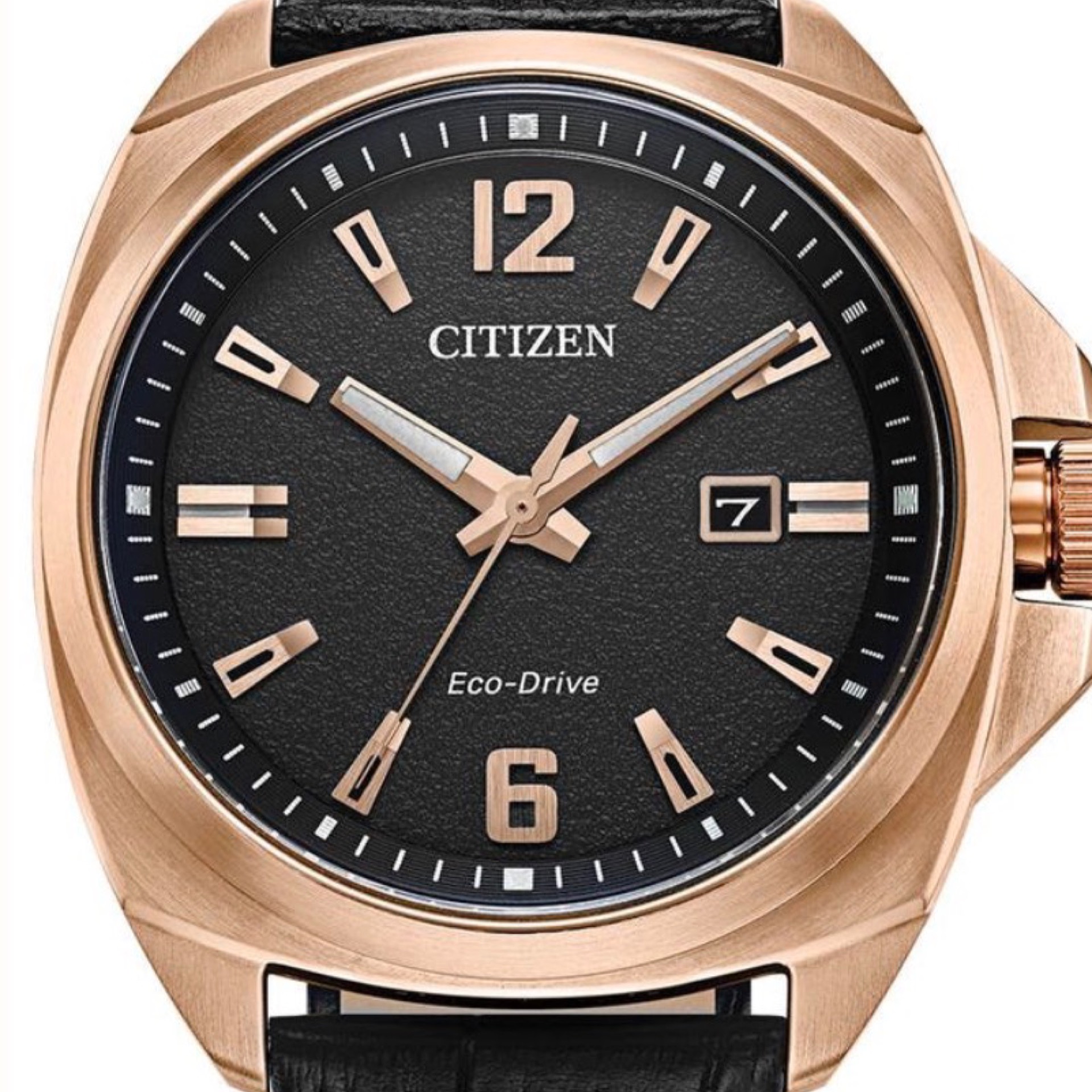 The Citizen Eco-Drive Sport AW1723-02E features a 42mm rose gold-tone stainless steel case paired with a sleek black leather strap secured by a pin buckle. Its black dial displays rose gold-tone Arabic numerals, baton indices, and luminous hands, alongside a date aperture at the 3 o'clock position, all protected by scratch-resistant sapphire crystal. Powered by Citizen's eco-friendly Eco-Drive technology, it uses light as a power source and requires no battery. Water-resistant up to 100 meters, this watch combines stylish design with reliable performance.