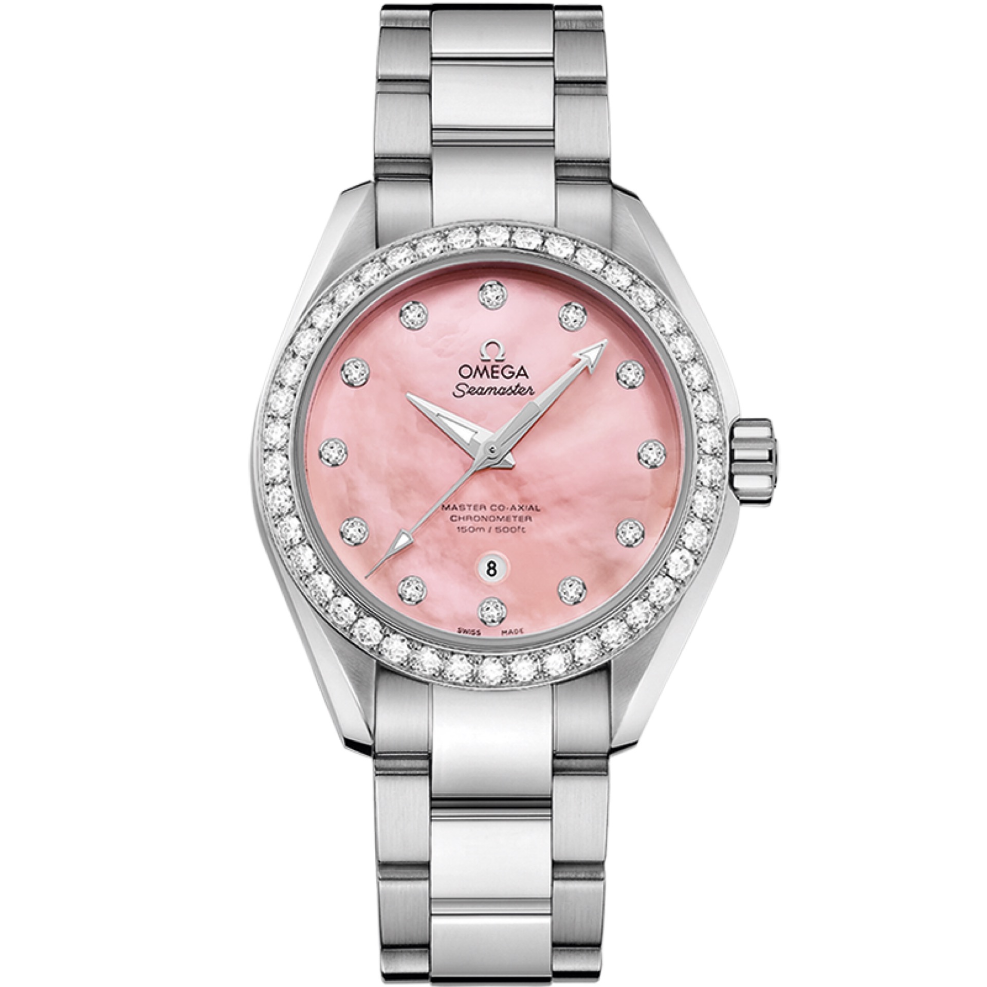 The SEAMASTER AQUA TERRA 231.15.34.20.57.003 presents a luxurious design combined with exceptional functionality, making it a standout timepiece for ladies. The case, crafted from high-quality steel, measures 34 mm in diameter with a thickness of 12.55 mm. Its domed, scratch-resistant sapphire crystal features anti-reflective treatment on both sides, ensuring optimal readability. With water resistance up to 15 bar (150 meters / 500 feet), this watch is both elegant and durable. Powered by the Omega 8520 self-winding movement with a 50-hour power reserve, it offers precise and reliable performance. The pink dial adds a touch of sophistication, while the total weight of approximately 107 grams ensures comfortable wear. This watch is the perfect balance of style and precision engineering for any occasion. (Watch is New in box )