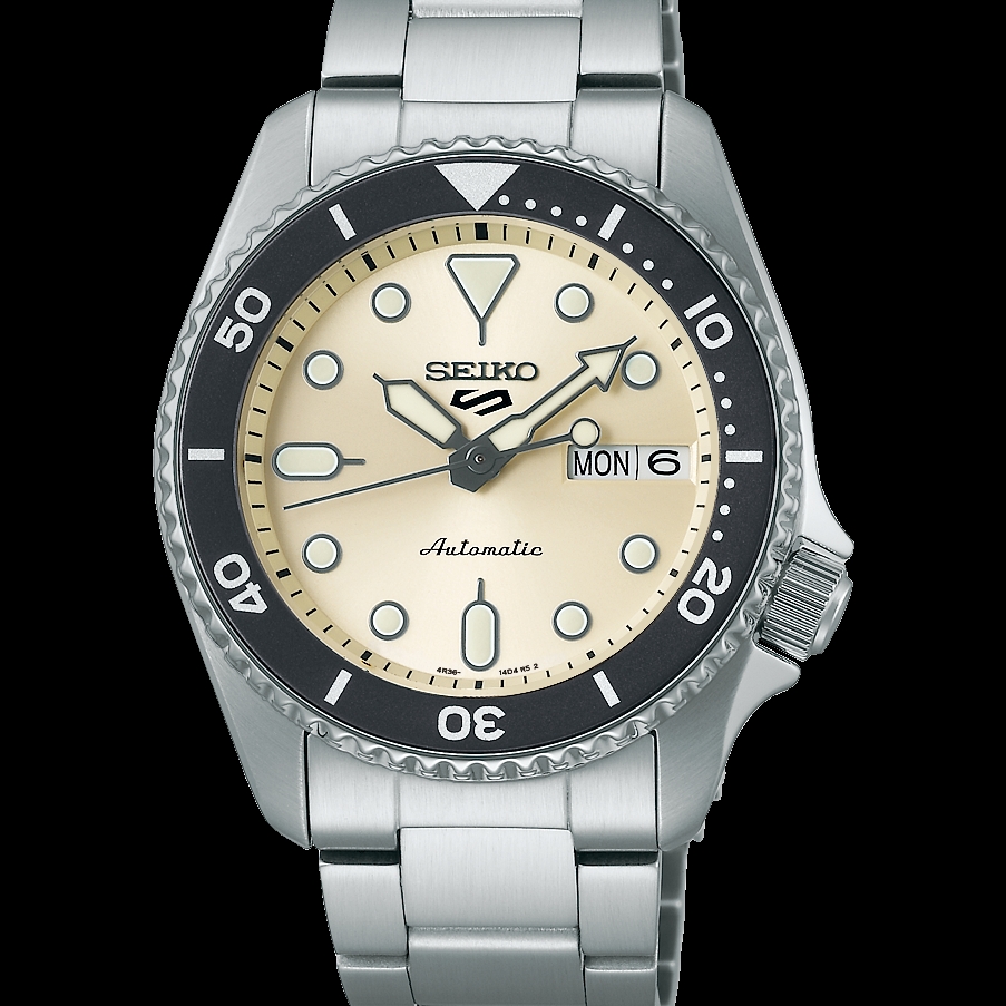 Seiko 5 Sports SKX Mid-Size. With vintage styling and colors recalling the quartz diver’s watches of the 1980s, the mid-size SKX design offers the 38mm case diameter of the originals, but with a slimmer case and a durable, yet comfortable, three-row sport bracelet. Providing automatic technology that you control with every movement, this dynamic timepiece is powered by a 24-jewel movement that beats at a frequency of 21,600 vibrations per hour, with a power reserve of approximately 41 hours and manual winding capability. The ivory dial, framed by a dark gray uni-directional rotating elapsed timing bezel, features a day/date calendar and luminous hands and markers. In stainless steel, with locking tri-fold push button release clasp and a screwdown see-through caseback for a view of classic timekeeping in action. 10 bar, 100M Water Resistant, 38mm case size.