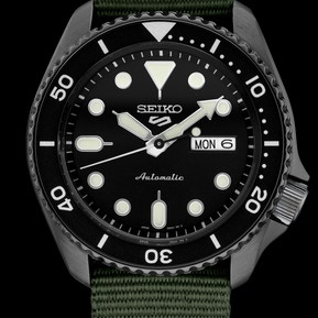 Show your style. Make your move. For over 50 years, Seiko 5 Sports has delivered consistently high levels of reliability, durability, and performance. For dependable timekeeping in your everyday life, this exceptional watch is powered by an automatic movement with a power reserve of approximately 41 hours and features a day/date calendar, LumiBrite hands and markers, and a see-through caseback. With a black ion finished stainless steel case and dark green nylon strap and a black dial framed by a black rotating bezel, this versatile watch is 100 meter water resistant- perfect for your style no matter what your day has in store.