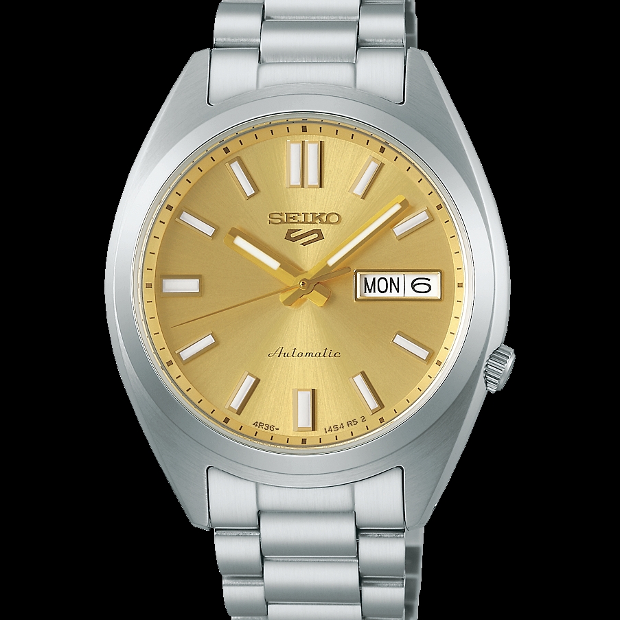 Show your style. Make your move. For over 50 years, Seiko 5 Sports has delivered consistently high levels of reliability, durability, and performance. Inspired by the best-selling SNXS series from the classic Seiko 5 collection of the past, this exceptional watch offers a compact case and bracelet design incorporating iconic elements of the original models with upgraded performance for today. Providing automatic technology that you control with every movement, this dynamic timepiece is powered by a 24-jewel movement that beats at a frequency of 21,600 vibrations per hour, with a power reserve of approximately 41 hours and manual winding capability. Framed by a metallic minute track, the golden sunray finish dial features diamond cut indices with gold finish and grooved top surfaces, a day/date calendar, and LumiBrite coating on the hands and markers for enhanced visibility in low-light conditions. Crafted of stainless steel with hairline and mirror finish, the sharply designed case has a low center of gravity for a comfortable fit and features a screwdown see-through caseback for a view of classic timekeeping in action, flowing seamlessly to a stainless steel bracelet with a tri-fold push button release clasp. 10 bar, 100M Water Resistant