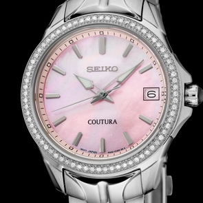 Expressing a polished and modern sophistication, the Coutura Collection combines bold angularity and elegant design with superior timekeeping for effortless sport/dress aesthetic. This versatile timepiece, perfect for day-to-night style, features a diamond bezel for a touch of luxury, and a shimmering pink mother-of-pearl dial with silver applied indices, adding a rich 3-dimensional appearance to the elegant look. Crafted of stainless steel, with 72 diamonds adorning the bezel and a perfectly proportioned case and bracelet for a streamlined fit, this graceful watch is topped with a scratch-resistant sapphire crystal and includes LumiBrite hands and markers, a date calendar, a classic cabochon crown, and a tri-fold push-button release clasp. 10 bar, 100M Water Resistant, 34mm case size.