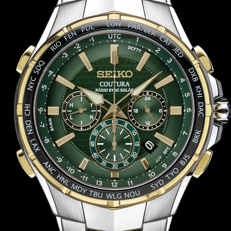 Delivering the perfect blend of sport and style for those on the move, this boldly distinctive radio sync solar chronograph provides effortless timekeeping excellence. Radio signals are received automatically to adjust the time and calendar throughout 25 world time zones. Framed by a world time bezel, the green sunray dial features chronograph and 24-hour subdials, power reserve and signal reception indicators, date calendar, and LumiBrite hands and markers. Crafted of stainless steel, with vigorously angular lines and gold accents on dial and case, this versatile watch includes a glass caseback, sapphire crystal and screwdown cabochon crown. The chronograph function offers timing to 60 minutes in 1/5-second increments with split time measurement. Powered by any light source, with no battery change required, the Solar Cell is energy-efficient, with a 6-month power reserve when fully charged. 10 bar, 100M Water Resistant, 45mm case size.