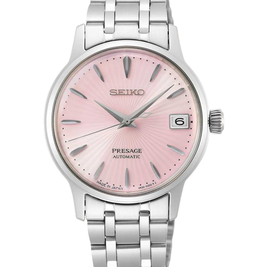 Offering the finest in Japanese mechanical watchmaking, the Presage Collection blends precision technology with superior craftsmanship and design. Inspired by the delights of a cocktail bar, this sophisticated watch features a pressed pattern, gloss finish and date calendar pink dial with pressed pattern, gloss finish and date calendar. The 23-jewel movement, with manual and automatic winding capability, beats at a frequency of 21,600 vibrations per hour, with a power reserve of approximately 41 hours. Crafted of stainless steel, this elegant timepiece includes a box-shaped crystal, screwdown see-through caseback, and double deployment clasp with push button release. 5 bar, 50M Water Resistant, 34mm case size.