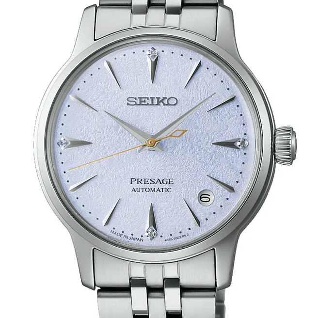 Offering the finest in Japanese mechanical watchmaking, the Presage Collection blends precision technology with superior craftsmanship and design. Offering a graceful and fresh twist to the popular Cocktail Time series, this charming watch, inspired by the Frozen Skydiving cocktail, features a lovely light blue dial with a stunning pressed pattern evoking crunchy ice. Four diamonds, artfully incorporated into the signature wedge-shaped markers at 12, 3, 6, and 9 o’clock, add a luxurious sparkle. The streamlined case houses a 23-jewel automatic movement, which beats at a frequency of 21,600 vibrations per hour, with a power reserve of approximately 41 hours and manual winding capability. Crafted of stainless steel with a delicately tapered bracelet, this distinctive timepiece includes a date calendar, box-shaped crystal, screwdown caseback, and deployment clasp with push-button release. 5 bar, 50M Water Resistant, 34mm case size.