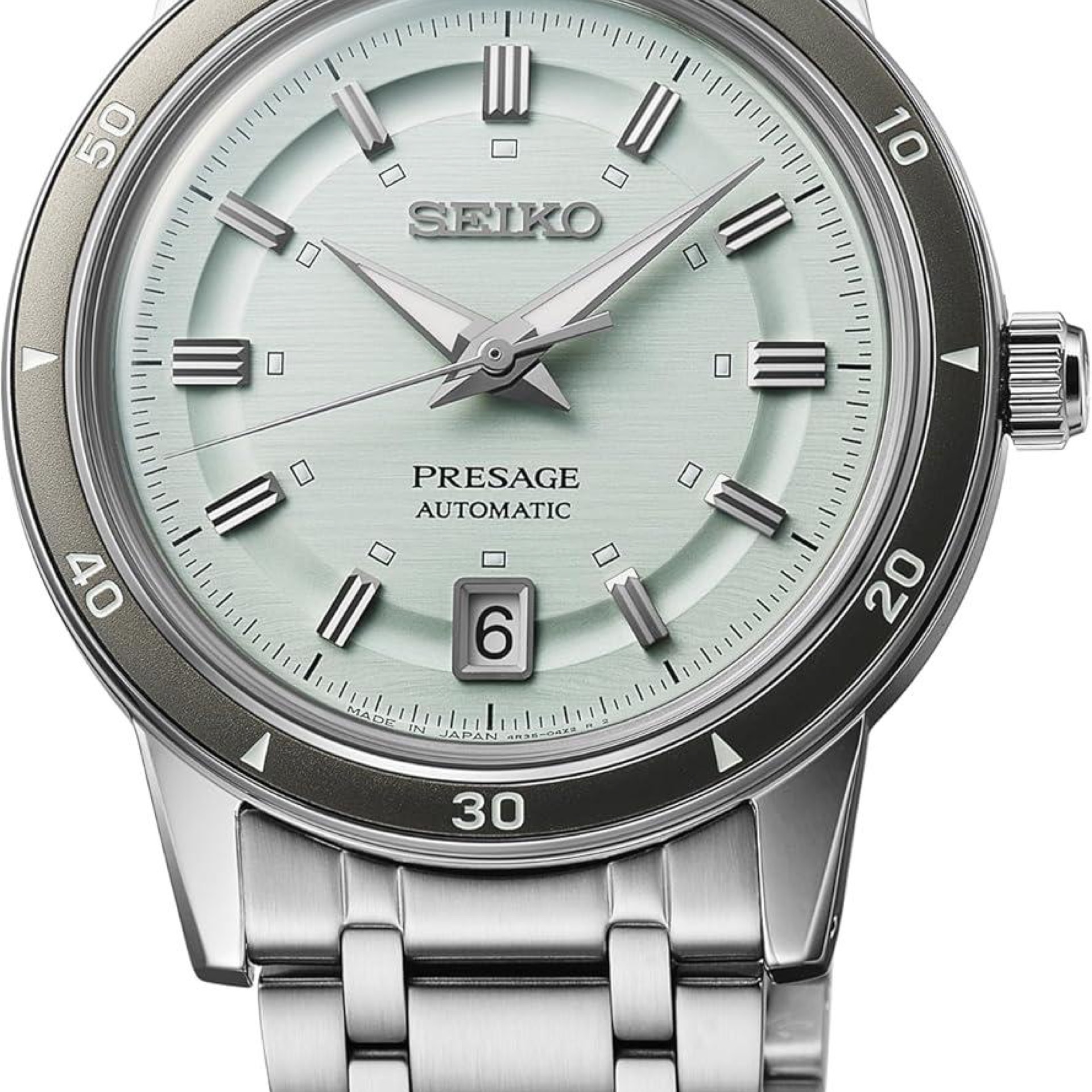 Presage Style60's Collection. Celebrating the fresh spirit of the 1960s, this design is an homage to Seiko’s 1964 “Crown Chronograph,” combining a bold ruggedness with a refined and tailored style. Framed by a coordinating metallic bezel, the multi-layer dial inherits the layout of the original model with a futuristic flair and an ice green color inspired by mid-century aesthetics. The faceted indices are polished for an elegant shine, enhanced by the stainless steel case and box shaped crystal, providing beautiful dimensionality. Visible underneath the screwdown see-through caseback, the 23-jewel automatic movement beats at a frequency of 21,600 vibrations per hour and offers manual winding capability with a power reserve of approximately 41 hours. Crafted of stainless steel, this versatile timepiece features a sophisticated multi-row bracelet, tri-fold push button release clasp, a date calendar and LumiBrite hands and markers for superior visibility. 5 bar, 50M Water Resistant