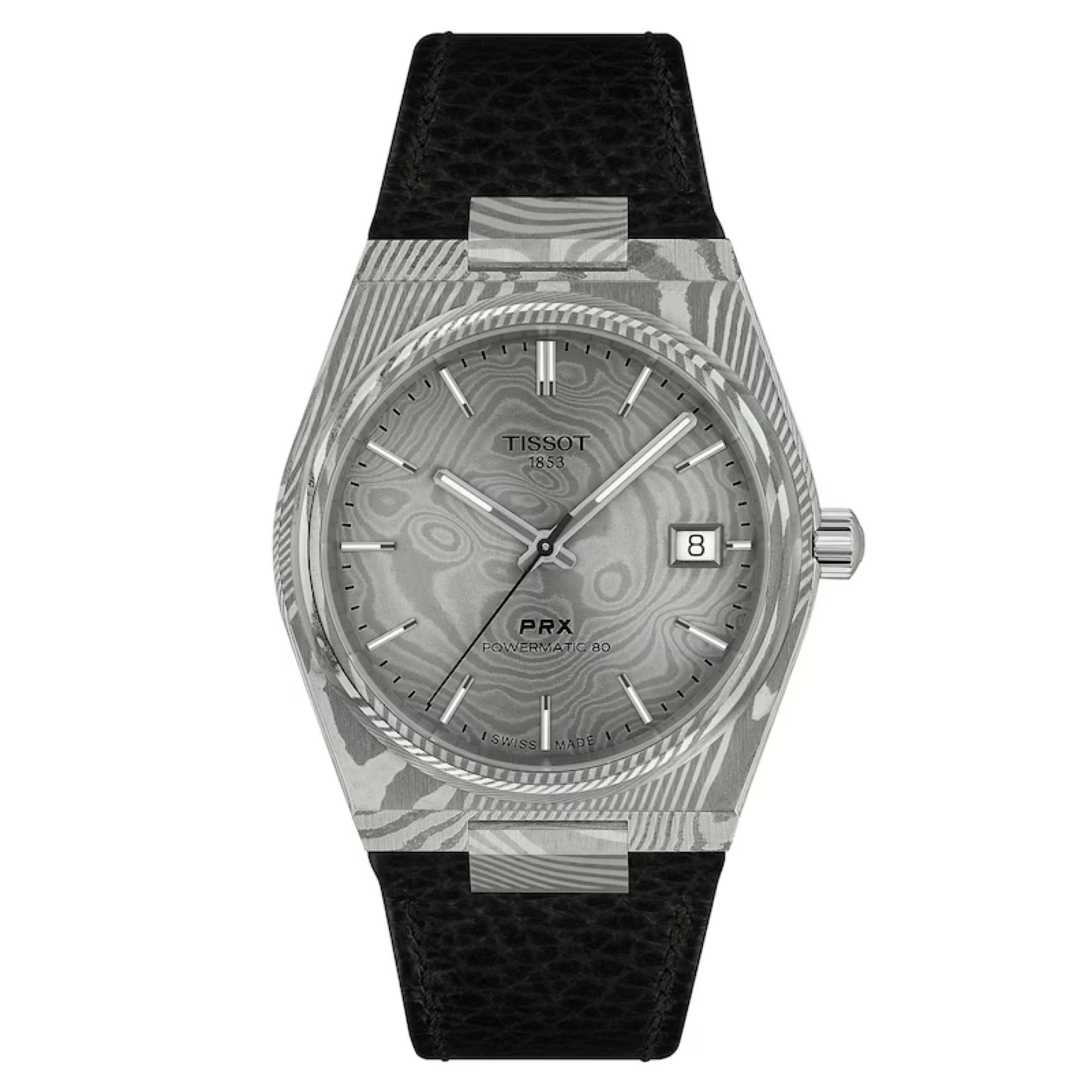 The Tissot PRX Automatic introduces a striking 38mm marbled Damascus stainless-steel case, ensuring each piece is uniquely patterned. Featuring a grey dial with Super-LumiNova® accents and a date window, it’s protected by a scratch-resistant sapphire crystal with anti-reflective coating. Powered by a Swiss automatic movement with an 80-hour power reserve, this watch combines precision and style. The interchangeable black leather strap with a quick-release system adds versatility, while water resistance up to 100 meters enhances durability.